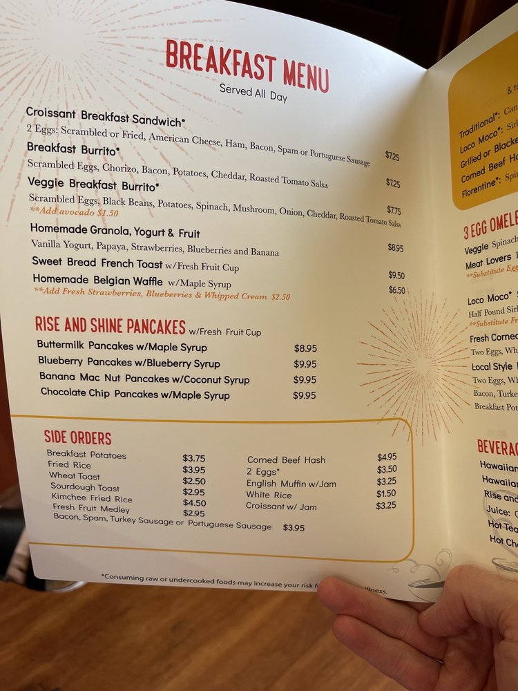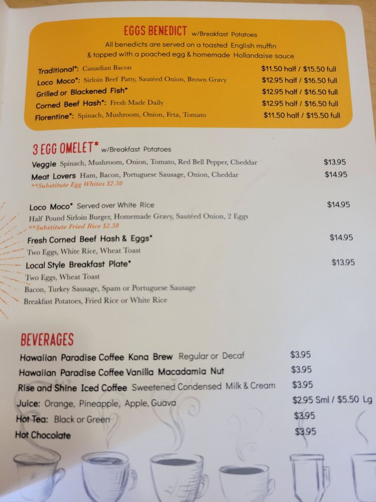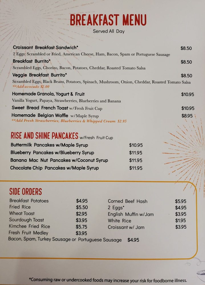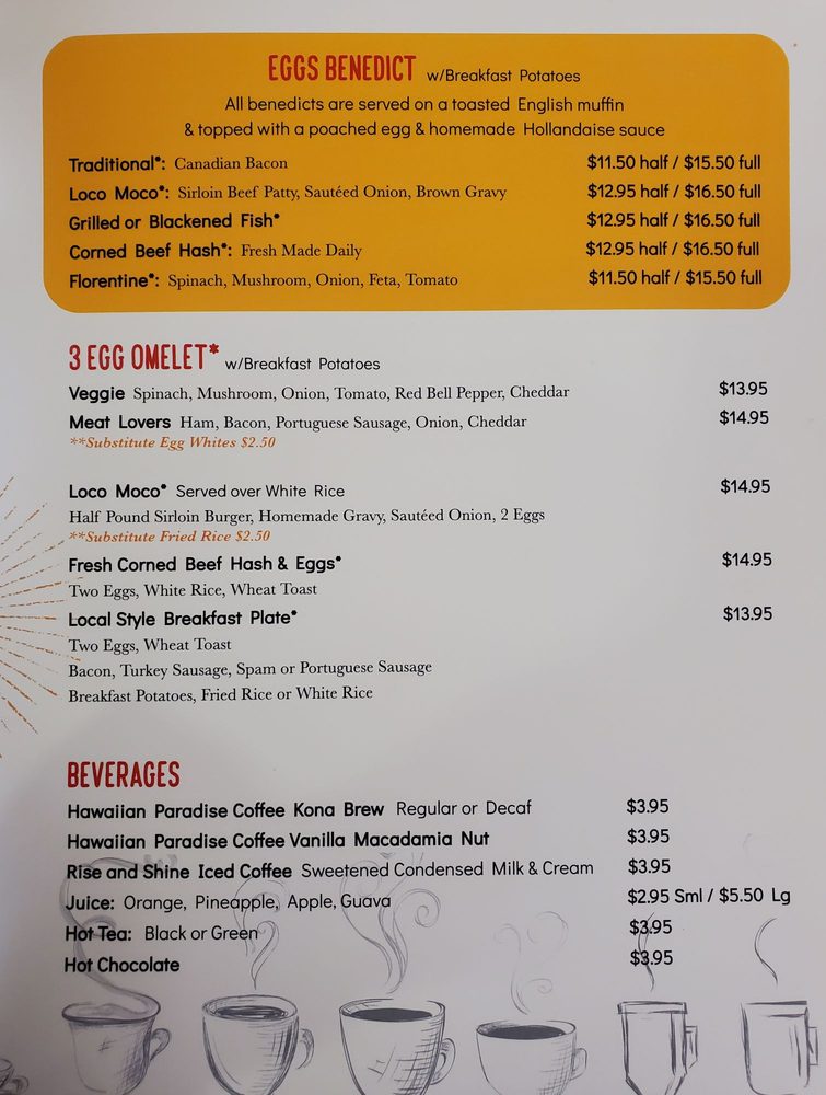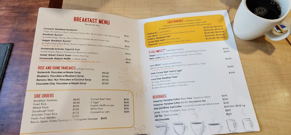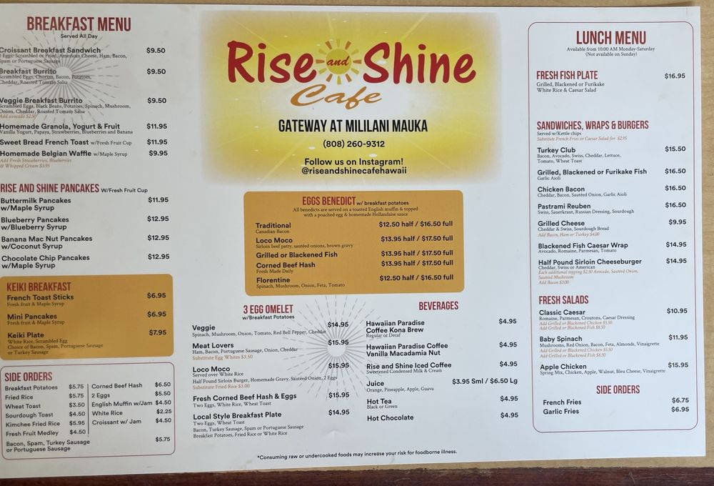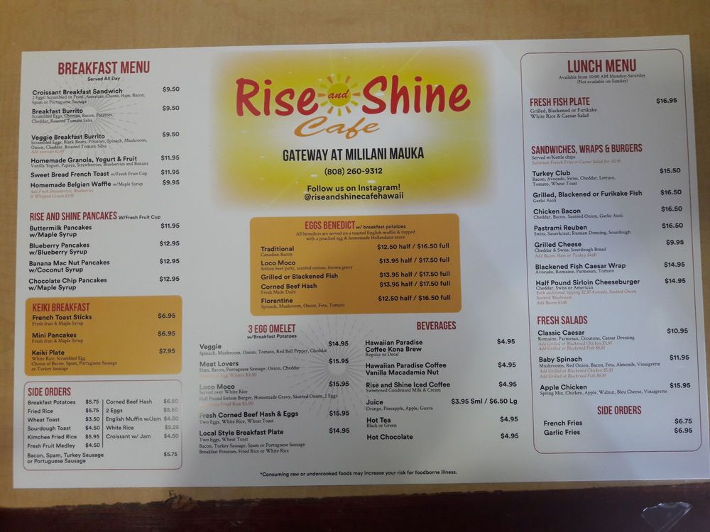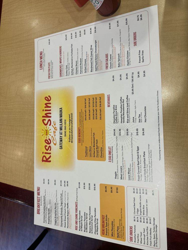 Introducing Rise and Shine Cafe, a charming breakfast and brunch spot located in Mililani, HI. This cafe offers a variety of delicious options in categories like Breakfast & Brunch, Desserts, and Sandwiches. Rise and Shine Cafe is known for its Takeout services, Vegan Options, and Wheelchair accessibility. With a classy yet casual ambiance, it's suitable for groups and kid-friendly. The menu features mouth-watering dishes like Corned Beef Eggs Benedict, Breakfast Burrito, and Loco Moco Eggs Benedict, alongside delightful desserts. Customers rave about the friendly service and large portions, with favorites like the Kimchee Fried Rice, huge pancakes, and flavorful Portuguese sausage. Rise and Shine Cafe is a must-visit for a fulfilling and satisfying breakfast experience.